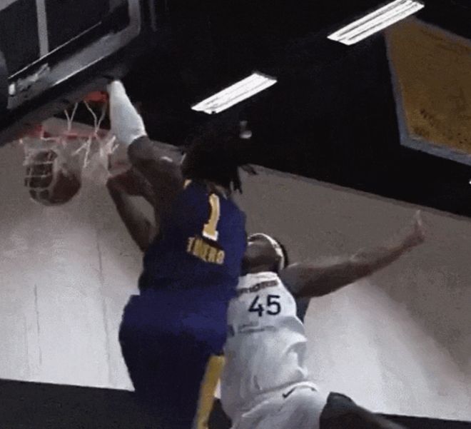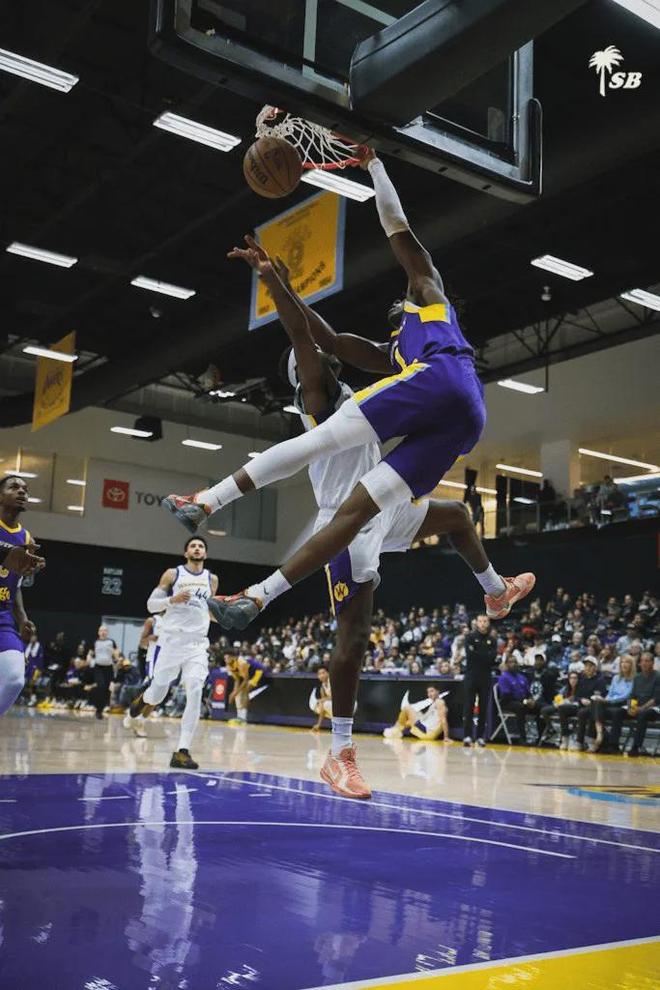 湖人25届次轮第6号秀蒂耶罗,在G联赛空接扣翻对手。